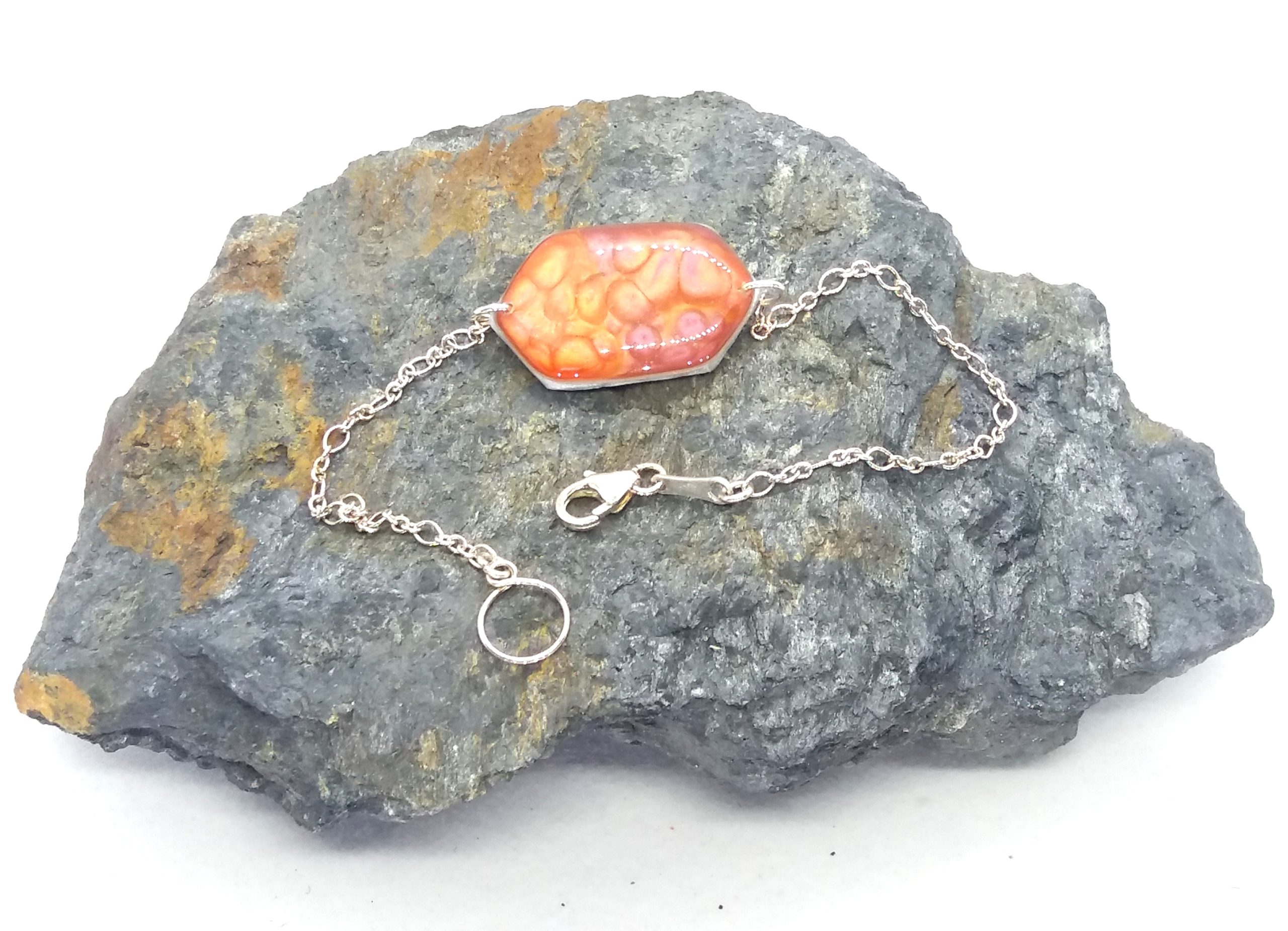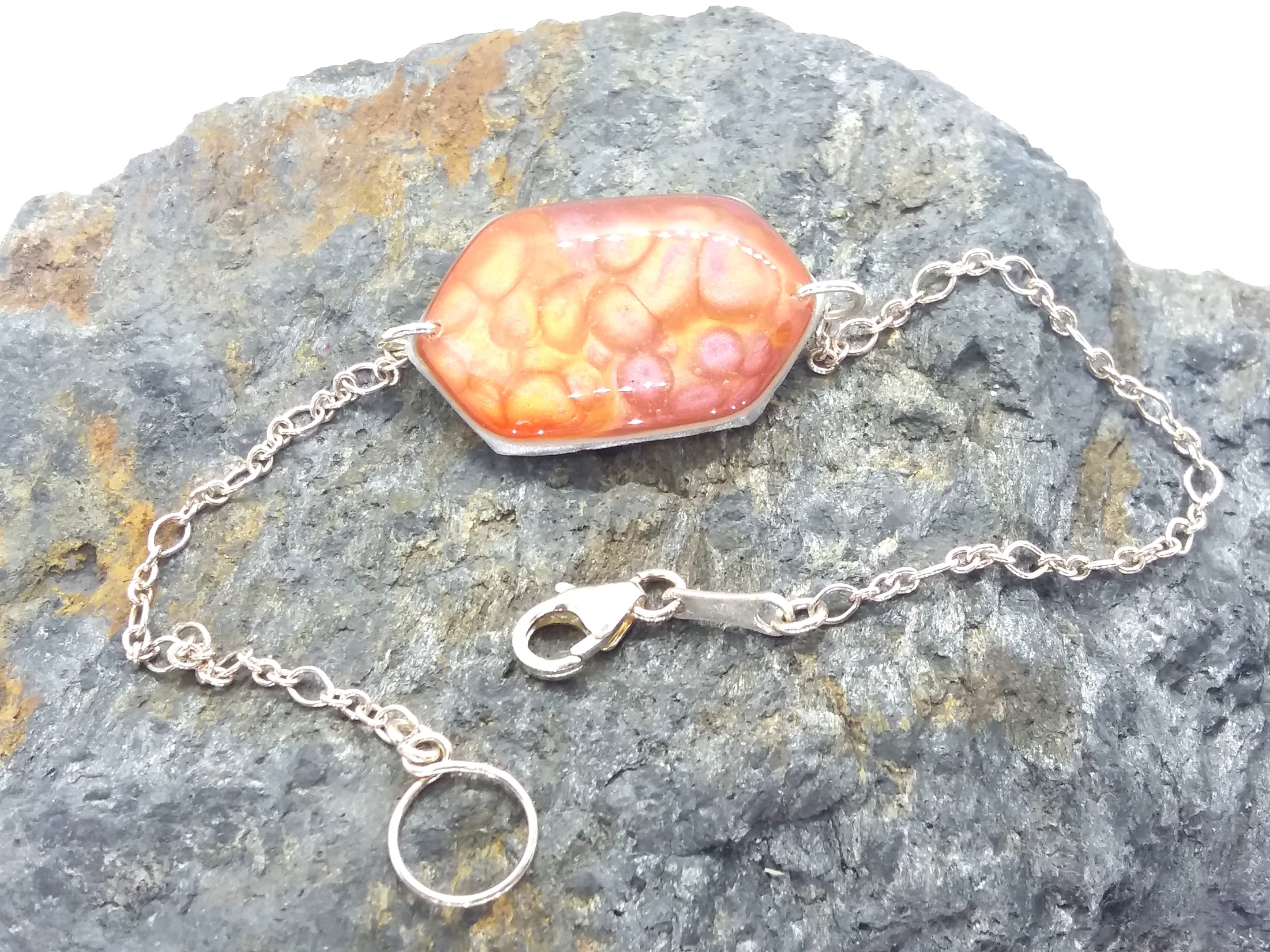 Bracelet artisanal avec chaine et fermoir en argent 925. Il nécessite près de 10 étapes de travail. La pièce centrale réalisée par un savant mélange de peintures émaux est protégée par deux couches de résine, ainsi se créé un motif unique que personne d’autre que vous n’aura. De plus son système d’attache s’adapte aisément à tous les poignets de 14 à 17 cm et facilite son accroche.