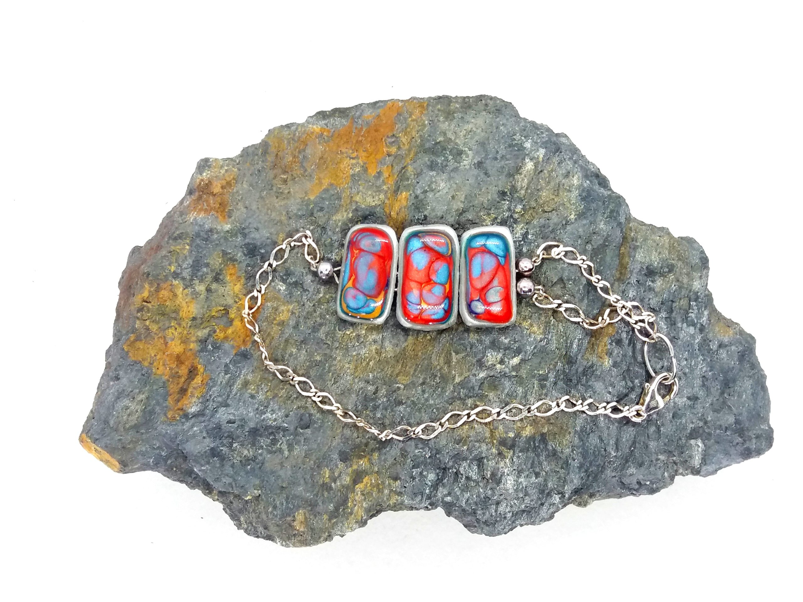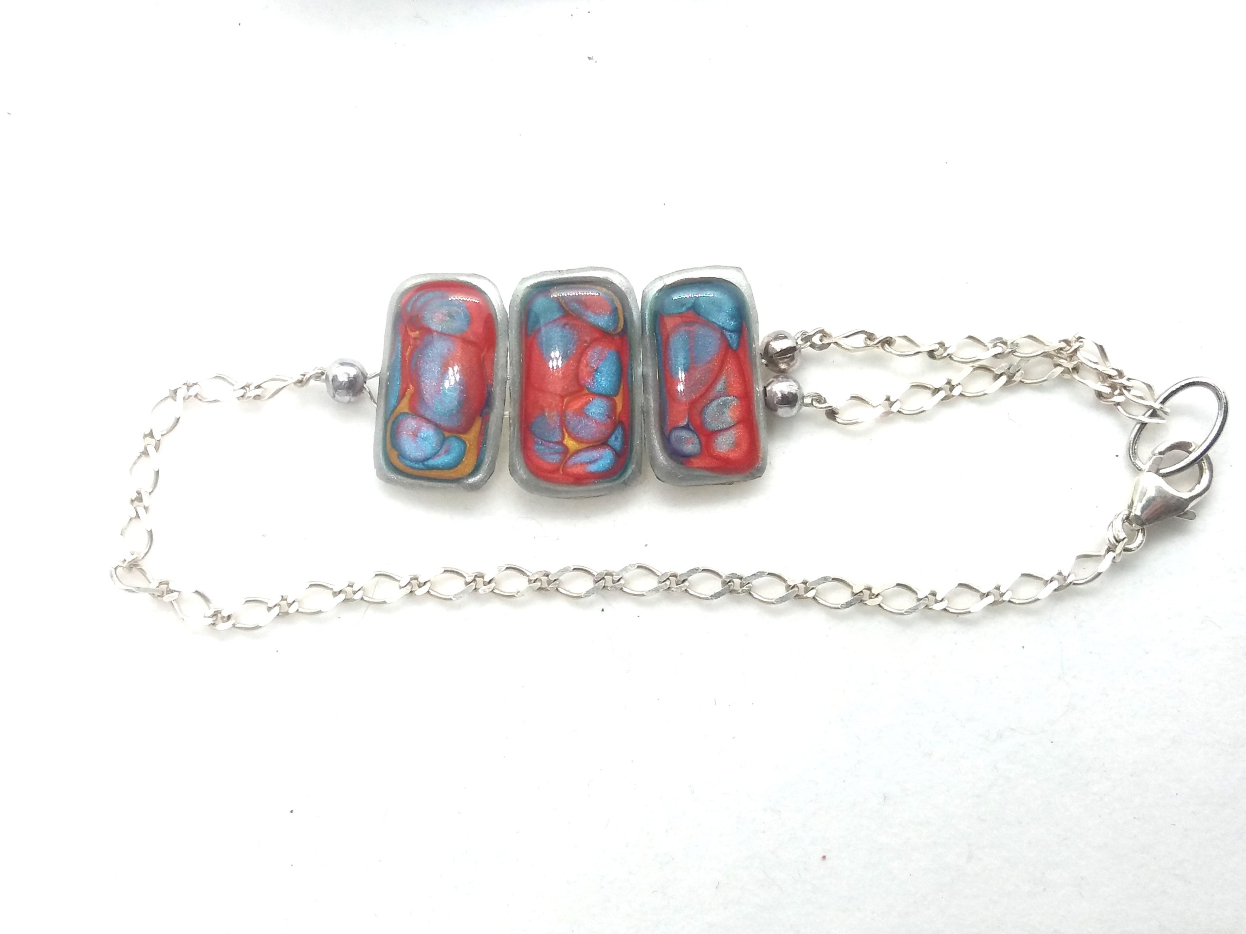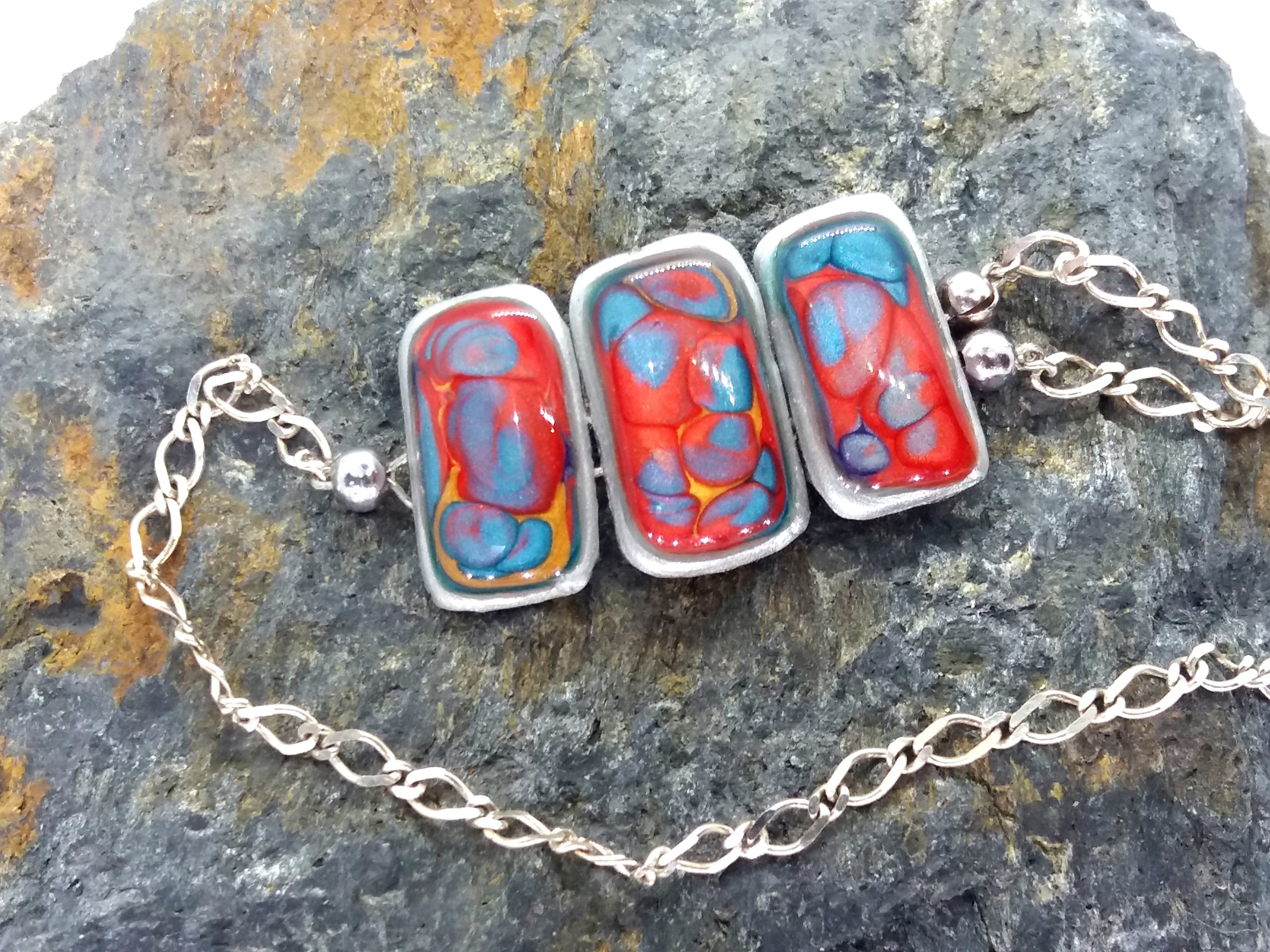Bracelet artisanal avec chaine et fermoir en argent 925. Il nécessite près de 10 étapes de travail. La pièce centrale est réalisée par un savant mélange de peintures émaux et protégée par une couche de résine, créant ainsi un motif unique que personne d’autre que vous n’aura. Son système d’attache s’adapte aisément à tous les poignets de 14 à 17 cm et facilite son accroche.