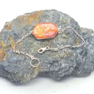 Bracelet artisanal avec chaine et fermoir en argent 925. Il nécessite près de 10 étapes de travail. La pièce centrale réalisée par un savant mélange de peintures émaux est protégée par deux couches de résine, ainsi se créé un motif unique que personne d’autre que vous n’aura. De plus son système d’attache s’adapte aisément à tous les poignets de 14 à 17 cm et facilite son accroche.