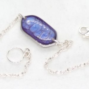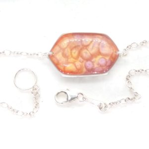 Bracelet artisanal avec chaine et fermoir en argent 925. Il nécessite près de 10 étapes de travail. La pièce centrale réalisée par un savant mélange de peintures émaux est protégée par deux couches de résine, ainsi se créé un motif unique que personne d’autre que vous n’aura. De plus son système d’attache s’adapte aisément à tous les poignets de 14 à 17 cm et facilite son accroche.