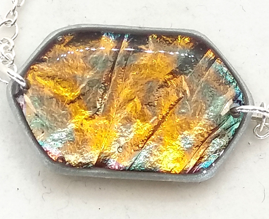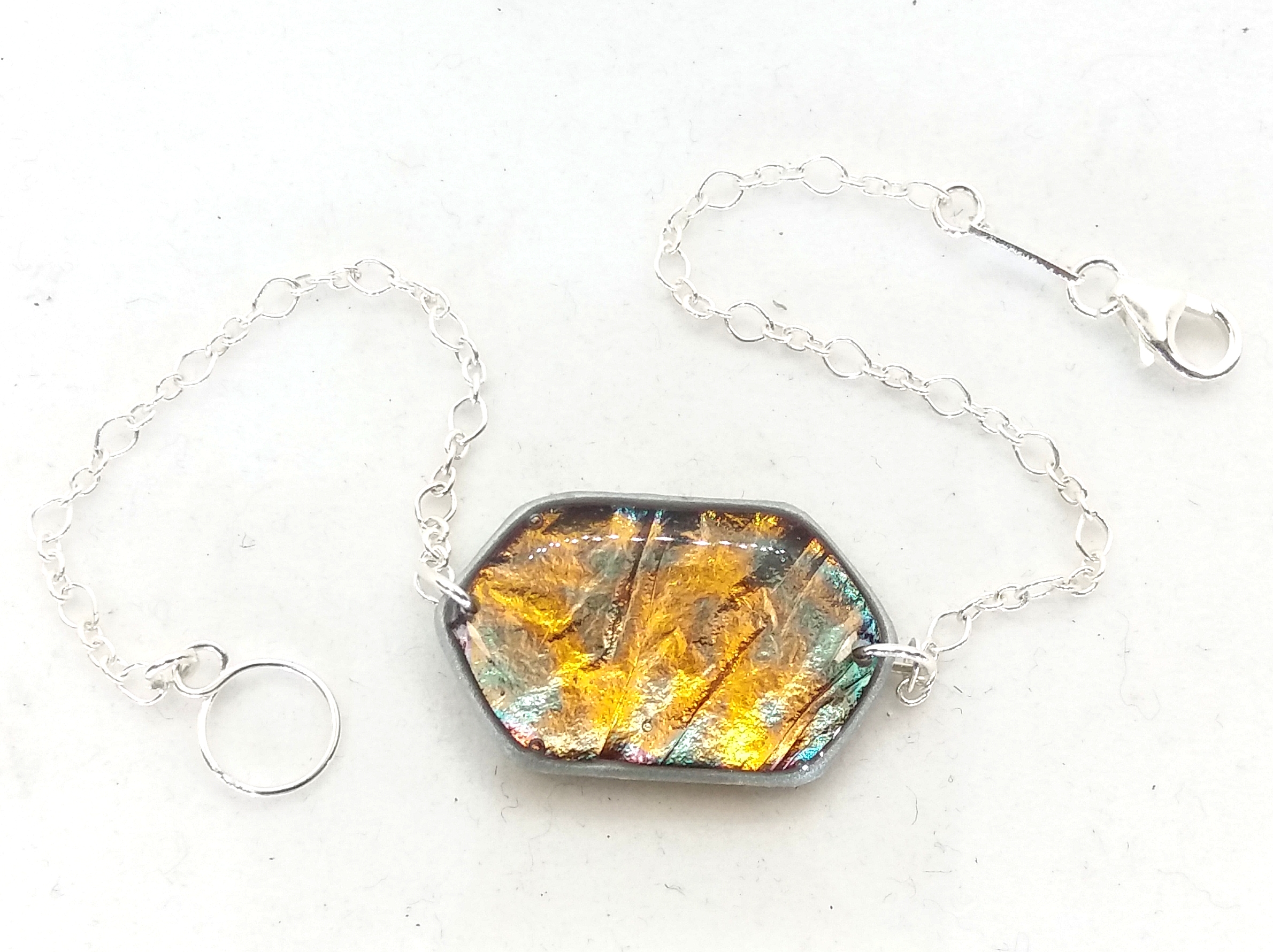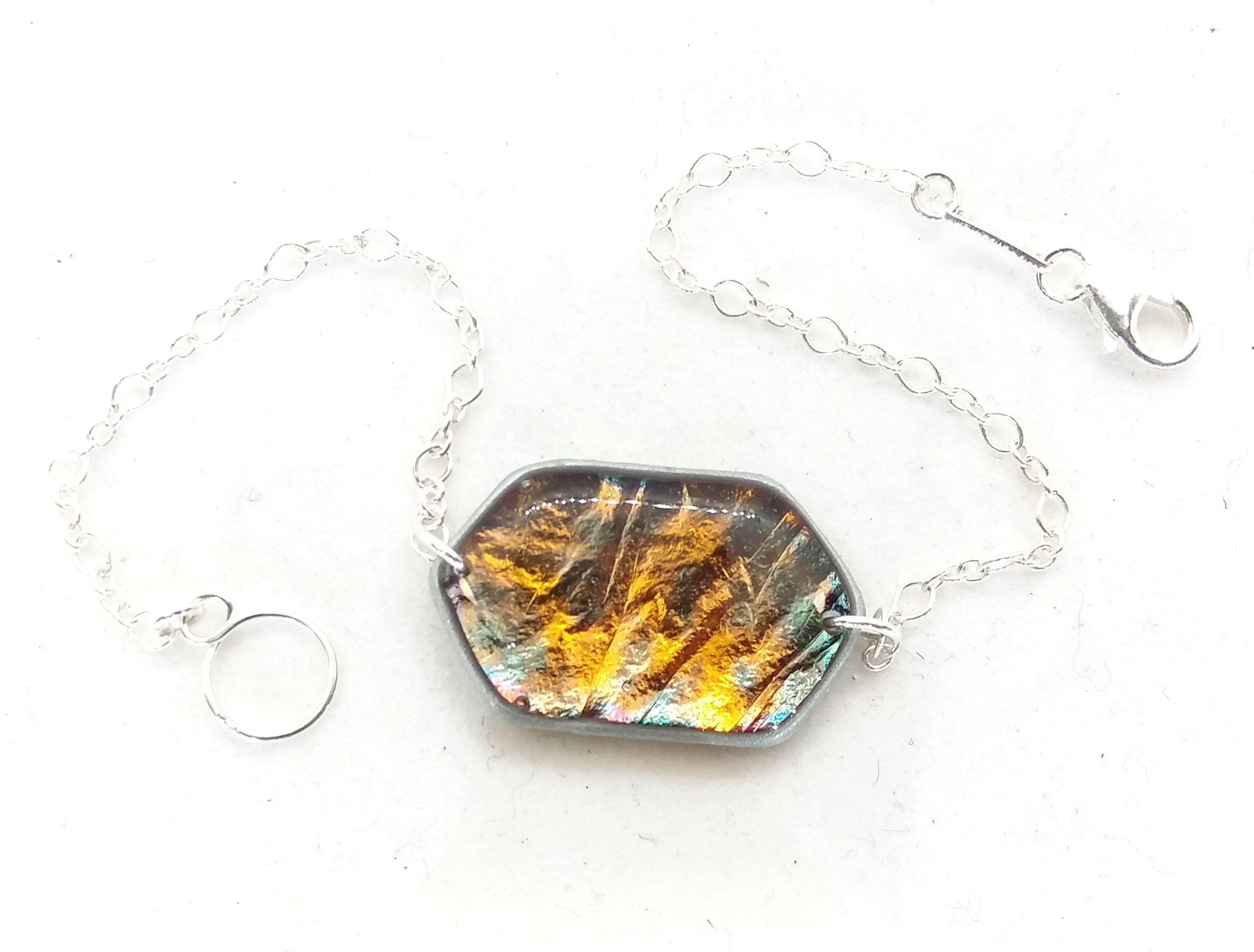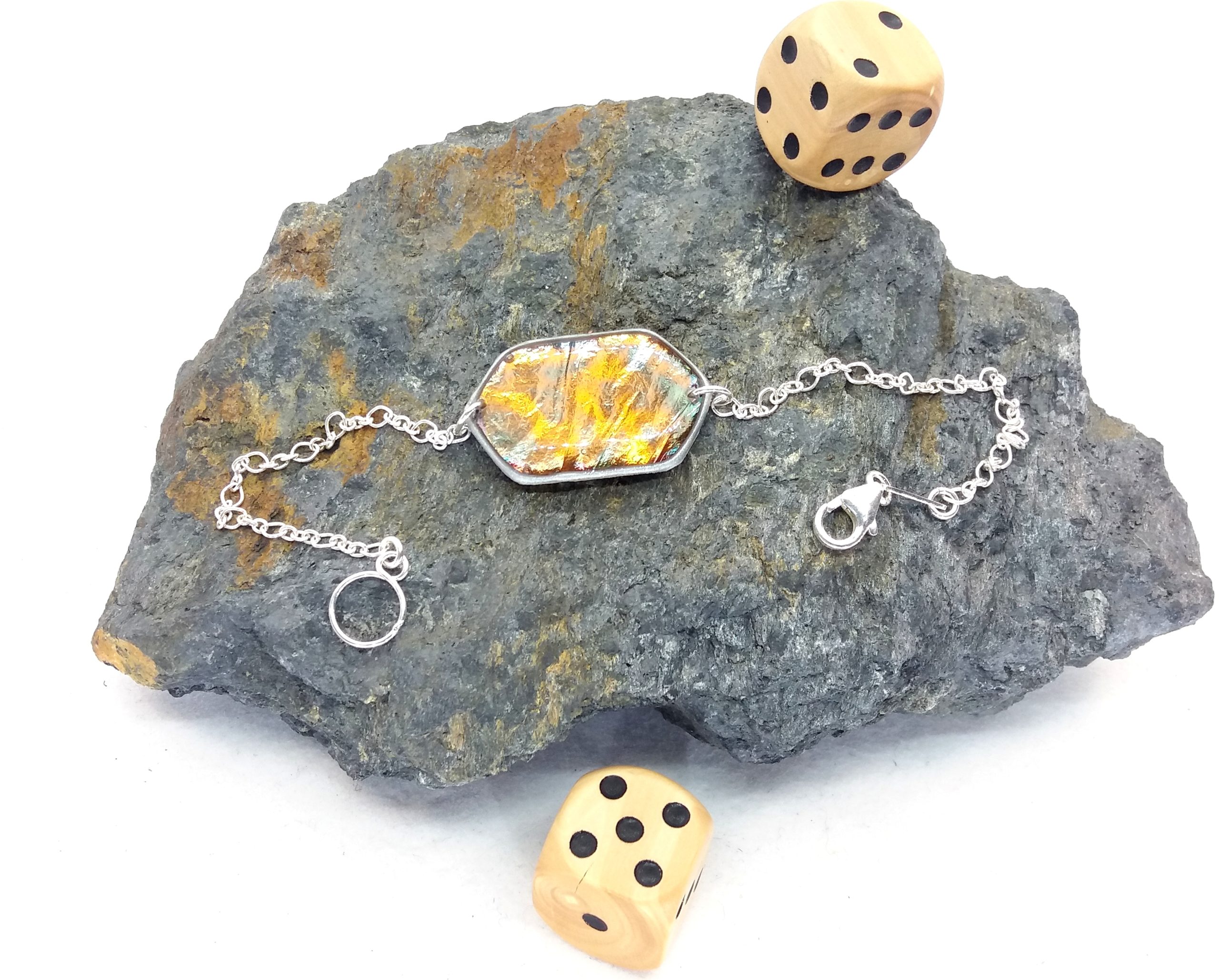 Bracelet artisanal avec chaine et fermoir en argent 925. Il nécessite près de 10 étapes de travail. La pièce centrale réalisée avec une feuille d’oxyde de cuivre protégée par deux couches de résine, ainsi se créé un motif unique que personne d’autre que vous n’aura et dont les couleurs métalliques ne s’estomperont pas. De plus son système d’attache s’adapte aisément à tous les poignets de 14 à 17 cm et facilite son accroche.