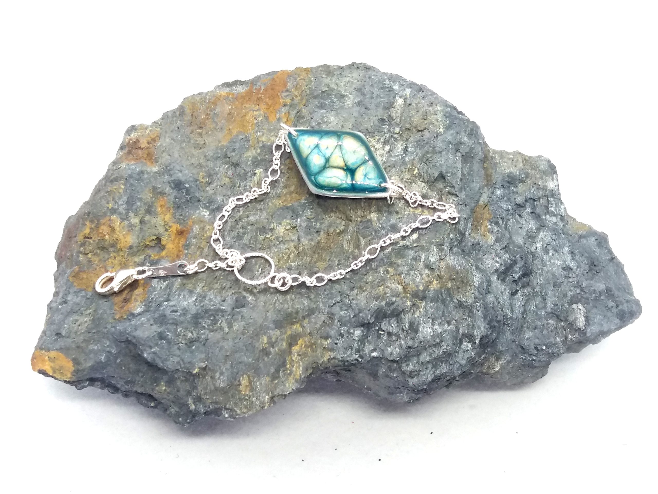 Bracelet artisanal avec chaine et fermoir en argent 925. Il nécessite près de 10 étapes de travail. La pièce centrale réalisée par un savant mélange de peintures émaux est protégée par deux couches de résine, ainsi se créé un motif unique que personne d’autre que vous n’aura. De plus son système d’attache s’adapte aisément à tous les poignets de 14 à 17 cm et facilite son accroche.