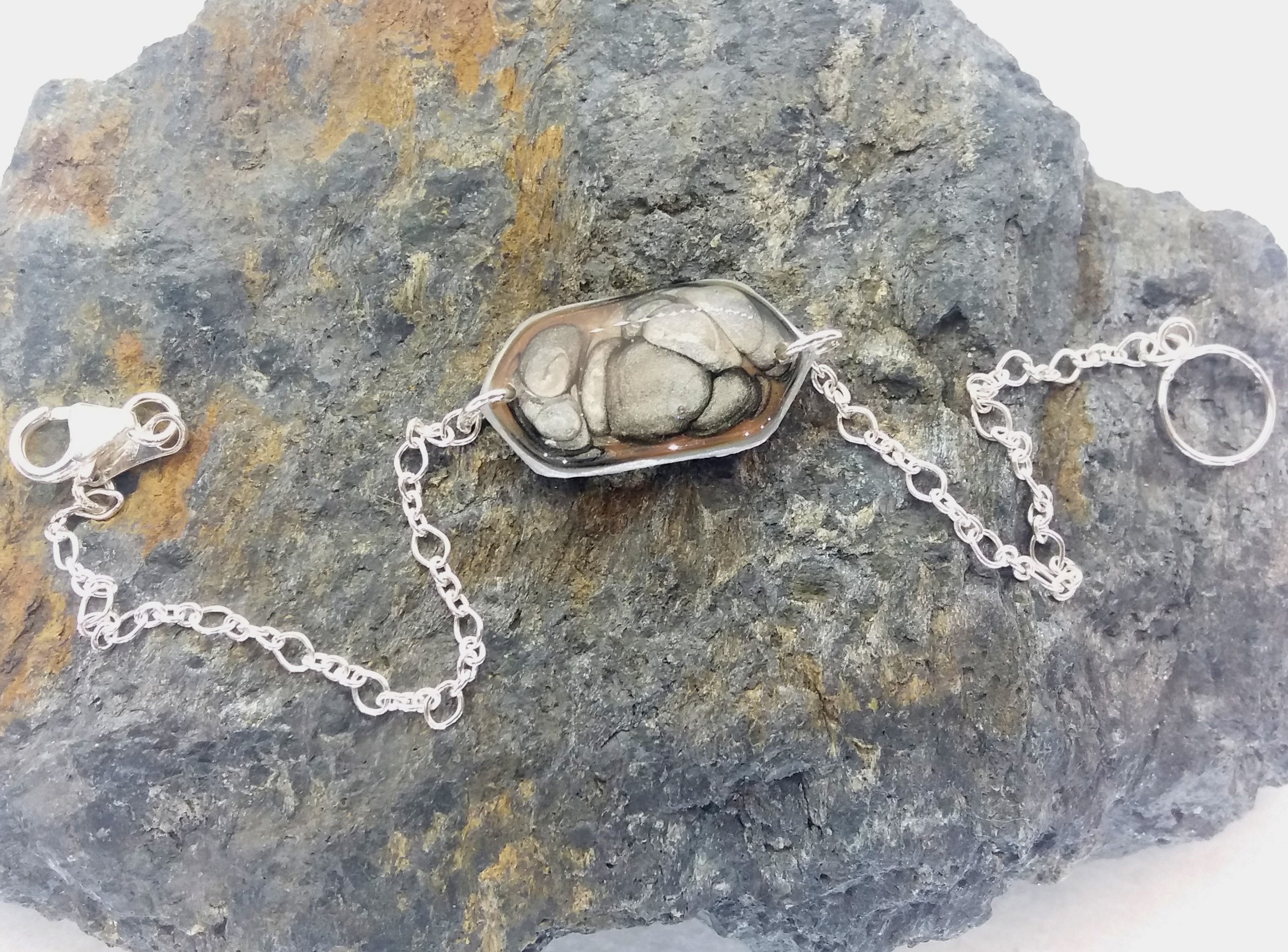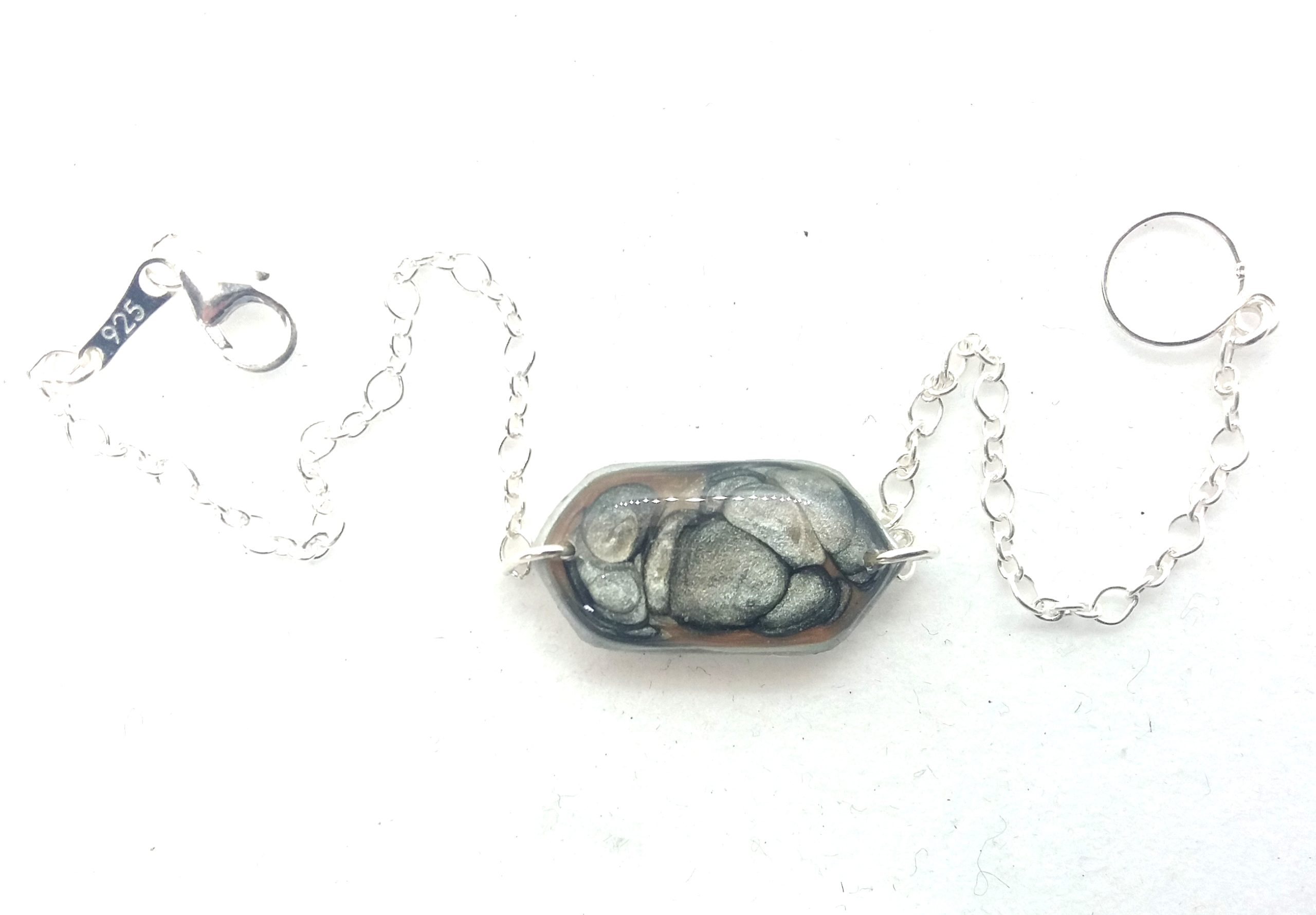 Bracelet artisanal avec chaine et fermoir en argent 925. Il nécessite près de 10 étapes de travail. La pièce centrale réalisée par un savant mélange de peintures émaux est protégée par deux couches de résine, ainsi se créé un motif unique que personne d’autre que vous n’aura. De plus son système d’attache s’adapte aisément à tous les poignets de 14 à 17 cm et facilite son accroche.