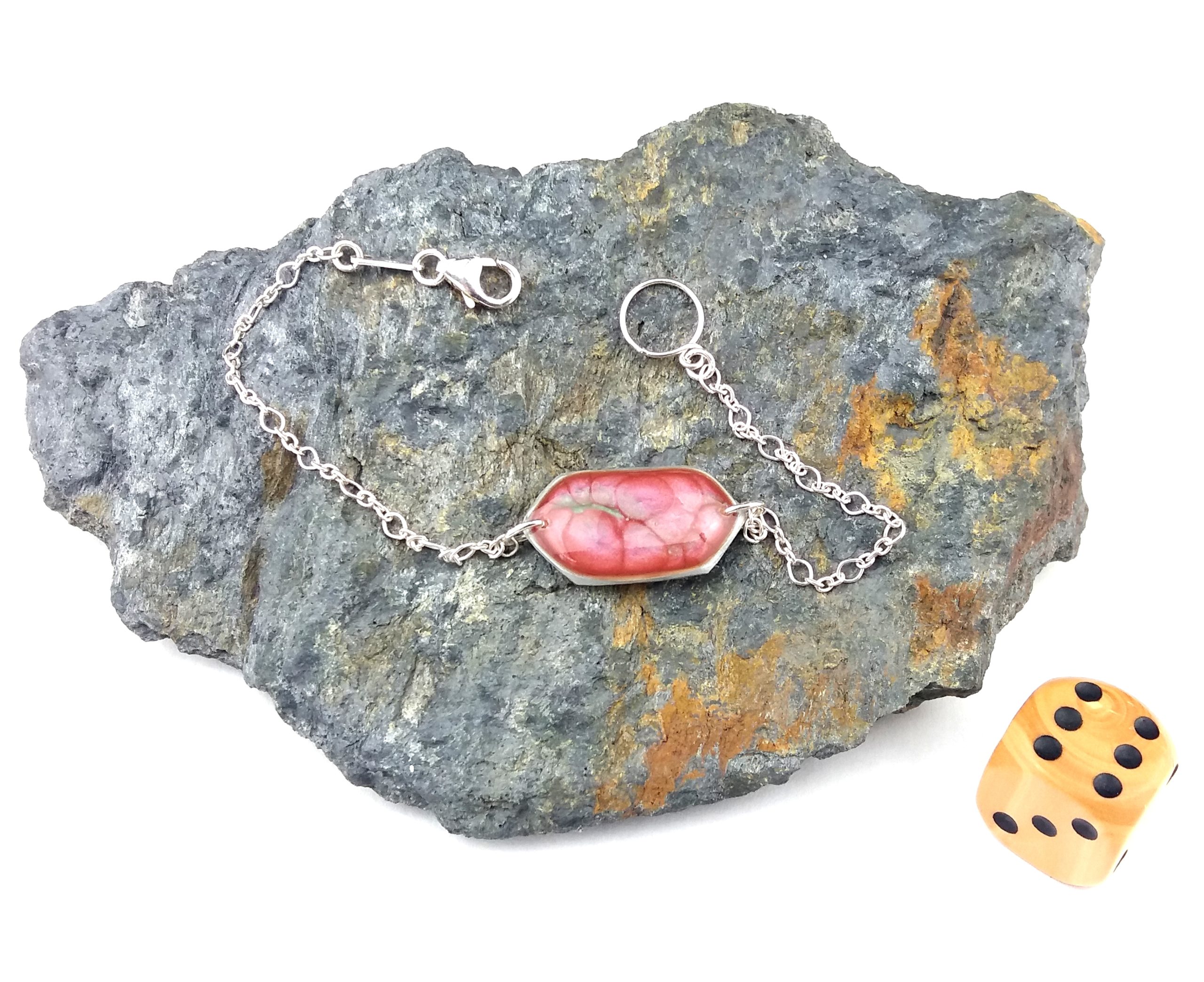 Bracelet artisanal avec chaine et fermoir en argent 925. Il nécessite près de 10 étapes de travail. Réalisée par un savant mélange de peintures émaux, la pièce centrale est protégée par deux couches de résine, ainsi se créé un motif unique que personne d’autre que vous n’aura. De plus son système d’attache s’adapte aisément à tous les poignets de 14 à 17 cm et facilite son accroche.