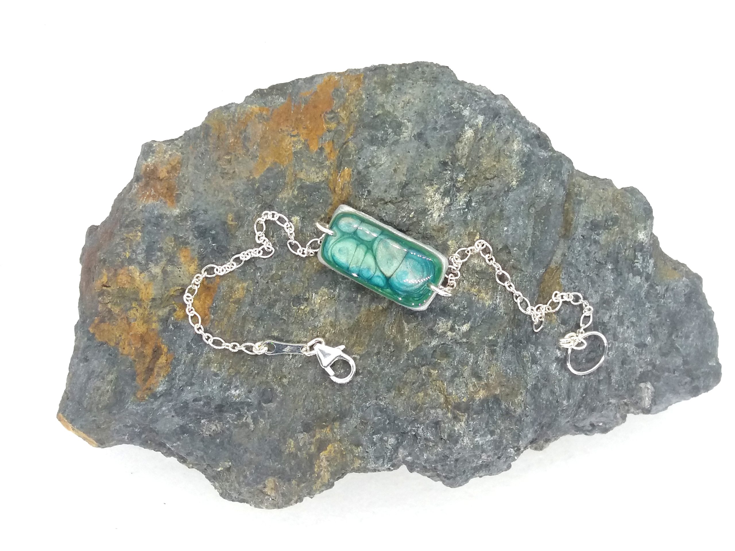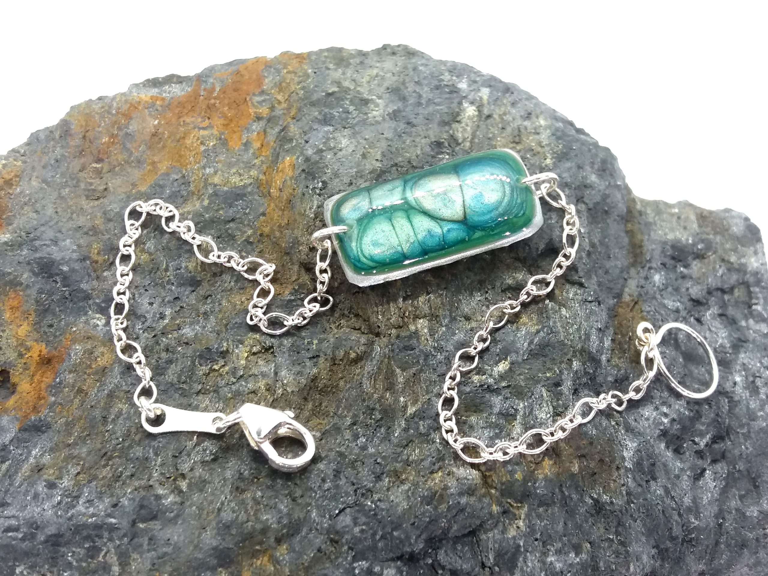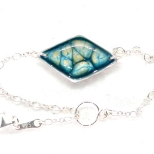 Bracelet artisanal avec chaine et fermoir en argent 925. Il nécessite près de 10 étapes de travail. La pièce centrale réalisée par un savant mélange de peintures émaux est protégée par deux couches de résine, ainsi se créé un motif unique que personne d’autre que vous n’aura. De plus son système d’attache s’adapte aisément à tous les poignets de 14 à 17 cm et facilite son accroche.